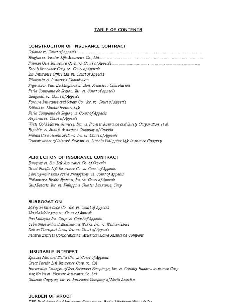 Insurance Table Of Contents Life Insurance Insurance